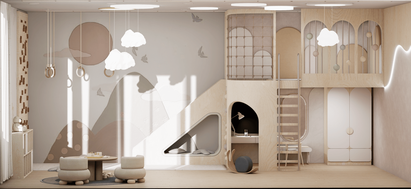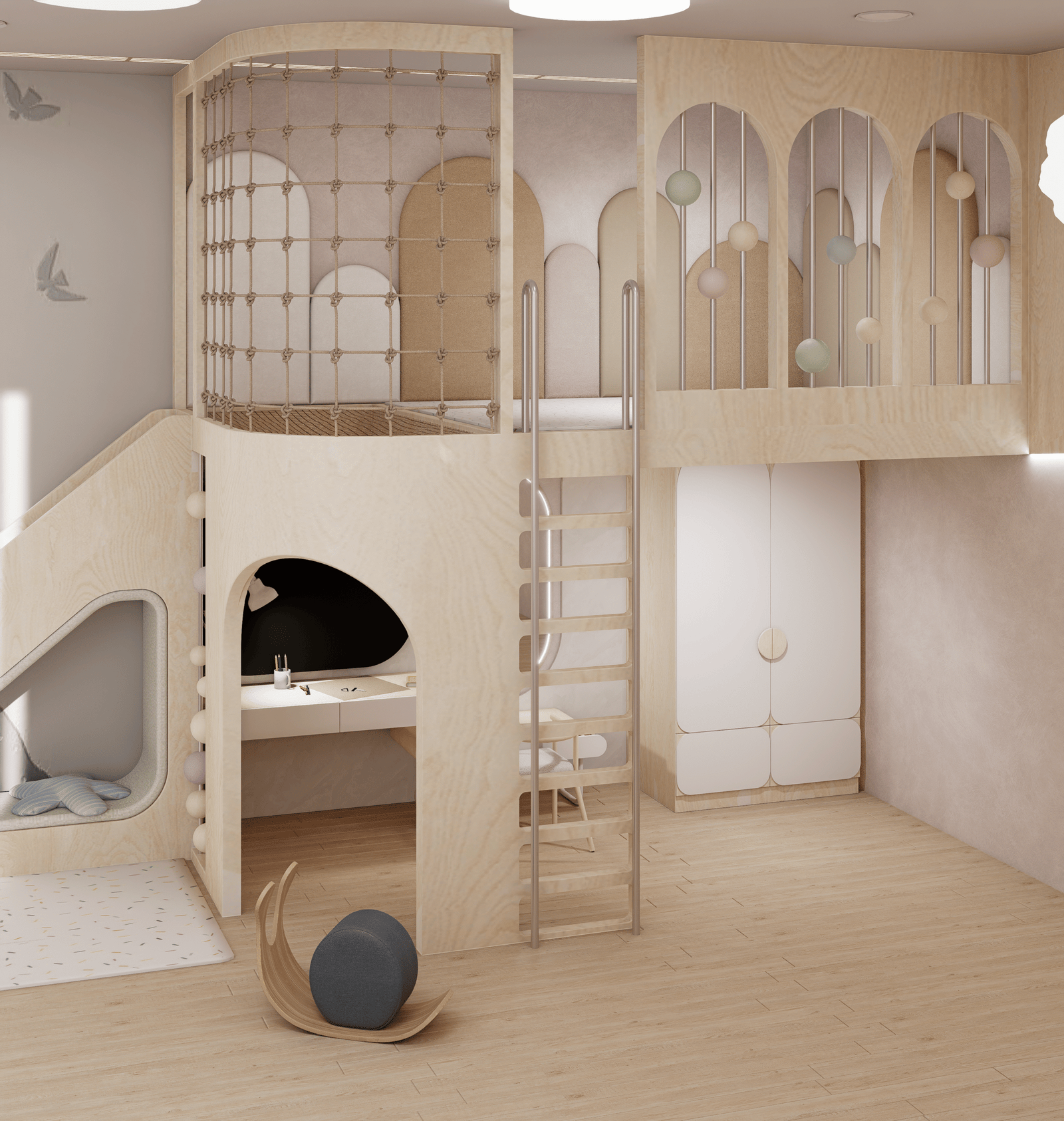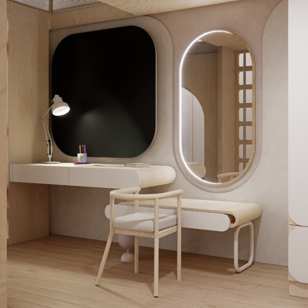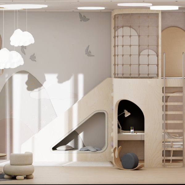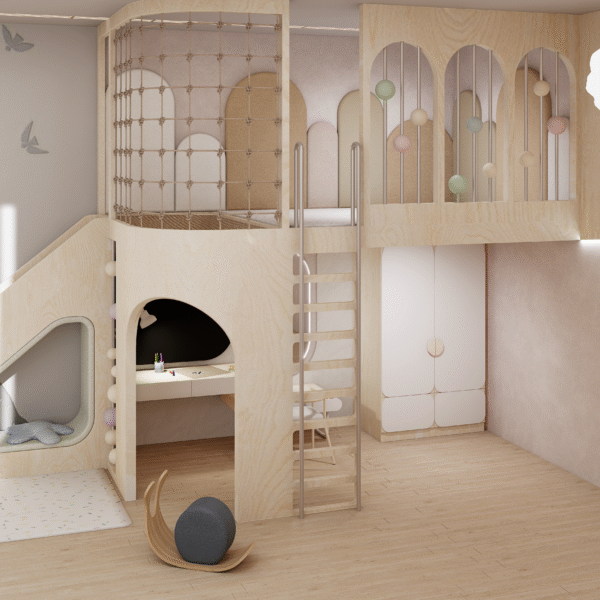 Step into a realm where Scandinavian serenity dances with childhood wonder—a lavish sanctuary braided from light and laughter for two inseparable sisters. Golden ash floors stretch like morning sunbeams, guiding tiny feet to a sculptural lofted kingdom crowned by cloud-soft pendants and recessed LED waves that hum gentleness into the air. A whisper-soft slide and woven climbing net beckon daring adventures, while pastel bead railings shimmer like captured rainbows. Hand-troweled plaster walls in chalky taupe and warm terracotta embrace each curve of the custom plywood alcoves and arched wardrobes—secret alcoves that cradle toys, books, and dreams out of sight. Beneath the lofty perch, an intimate study nook glows under an oval LED mirror, inviting hushed storytelling and creative flights of fancy. Every surface—from the organic drapes to the wool-blend rug—is chosen for its whispered luxury and pure, healthful promise. Here, in this poetic cocoon of light, texture, and grace, sisterly bonds deepen, imaginations wander free, and every bedtime becomes a magical ritual of comfort and connection.
