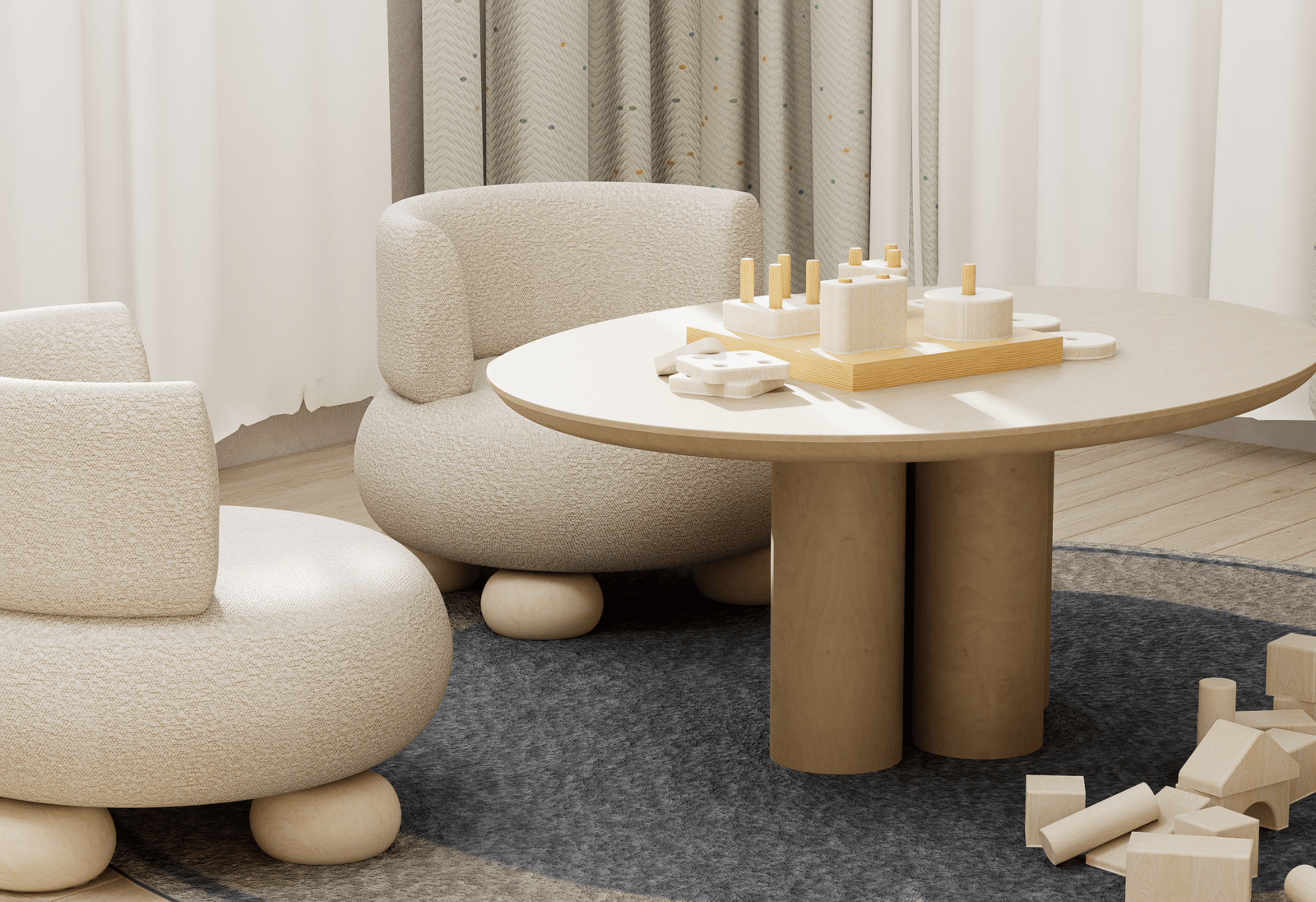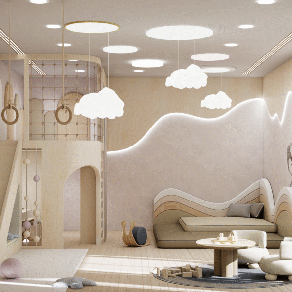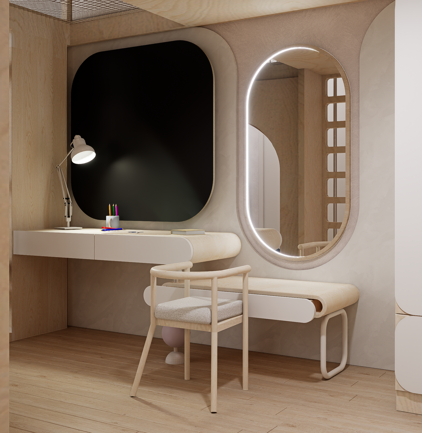 Step into a realm where Scandinavian serenity dances with childhood wonder—a lavish sanctuary braided from light and laughter for two inseparable sisters. Golden ash floors stretch like morning sunbeams, guiding tiny feet to a sculptural lofted kingdom crowned by cloud-soft pendants and recessed LED waves that hum gentleness into the air. A whisper-soft slide and woven climbing net beckon daring adventures, while pastel bead railings shimmer like captured rainbows. Hand-troweled plaster walls in chalky taupe and warm terracotta embrace each curve of the custom plywood alcoves and arched wardrobes—secret alcoves that cradle toys, books, and dreams out of sight. Beneath the lofty perch, an intimate study nook glows under an oval LED mirror, inviting hushed storytelling and creative flights of fancy. Every surface—from the organic drapes to the wool-blend rug—is chosen for its whispered luxury and pure, healthful promise. Here, in this poetic cocoon of light, texture, and grace, sisterly bonds deepen, imaginations wander free, and every bedtime becomes a magical ritual of comfort and connection.